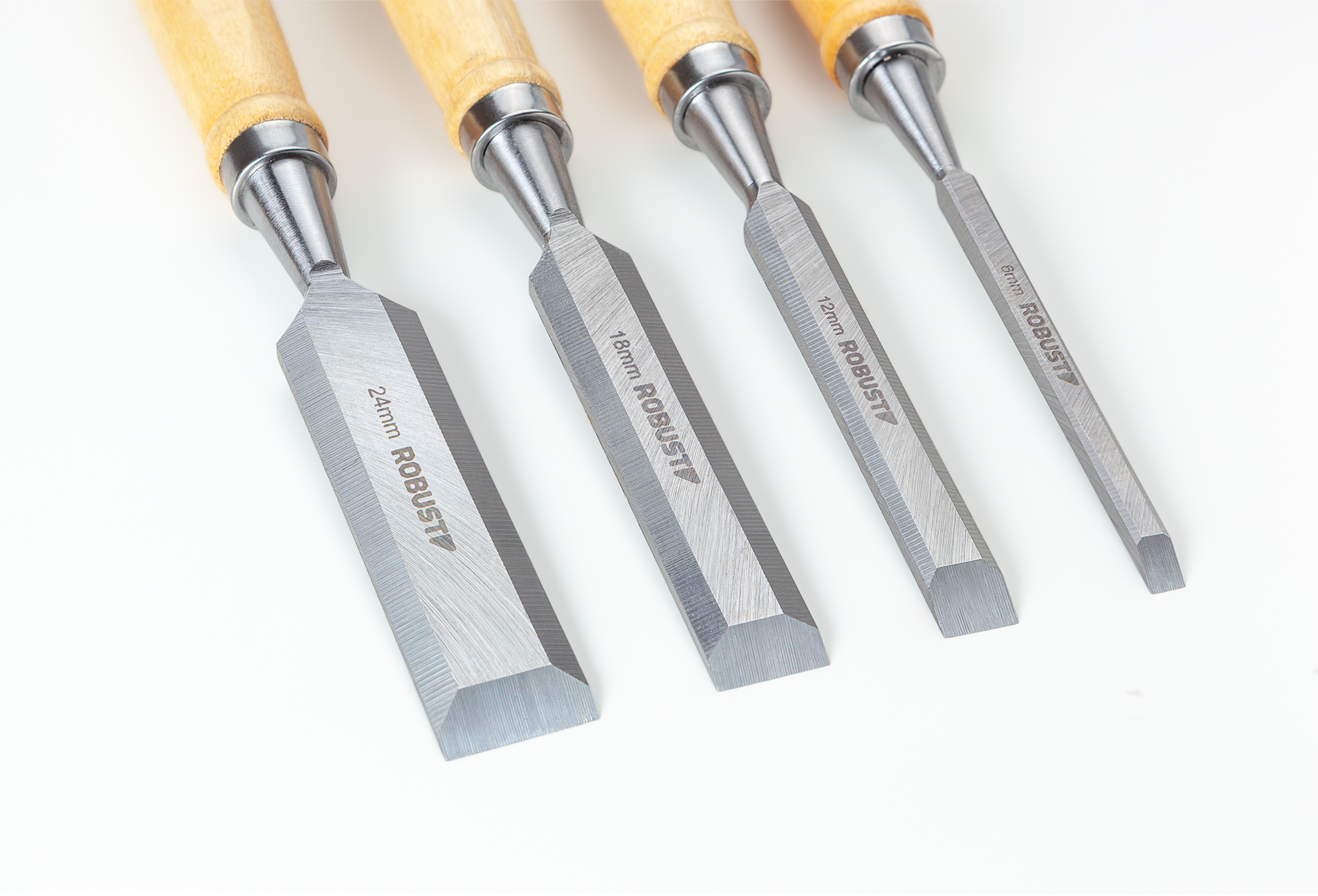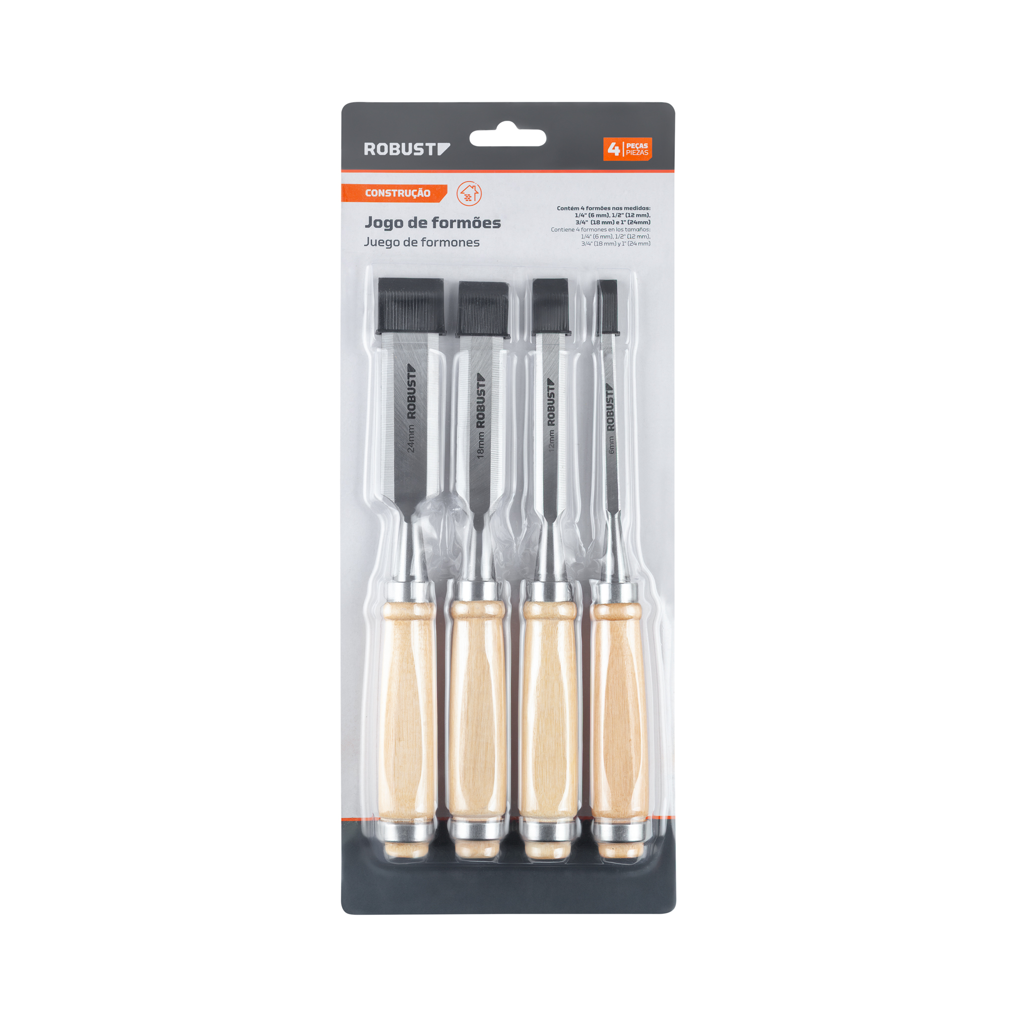 - › 4 formões (1/4″, 1/2″, 3/4″ e 1″) que atendem diferentes tipos de trabalho em madeira.