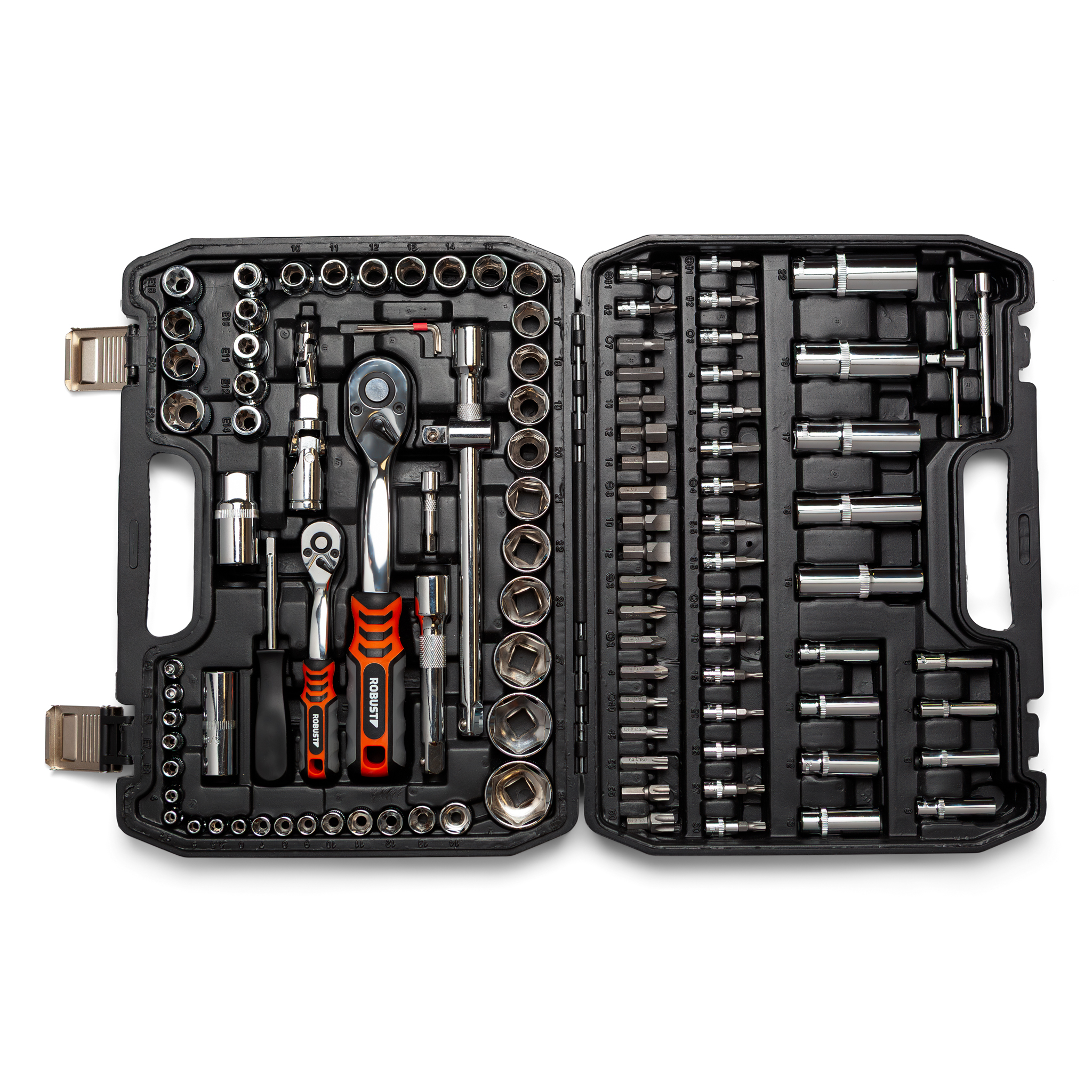 Jogo de soquetes com 108 peças, cobrindo diferentes perfis, medidas milimétricas e em polegada. Inclui soquetes longos e curtos, chaves catraca ¼” e ½”, adaptadores, juntas e bits. Atende desde pequenos reparos até manutenções mais complexas em veículos. Solução versátil que une qualidade e organização em uma única maleta.
