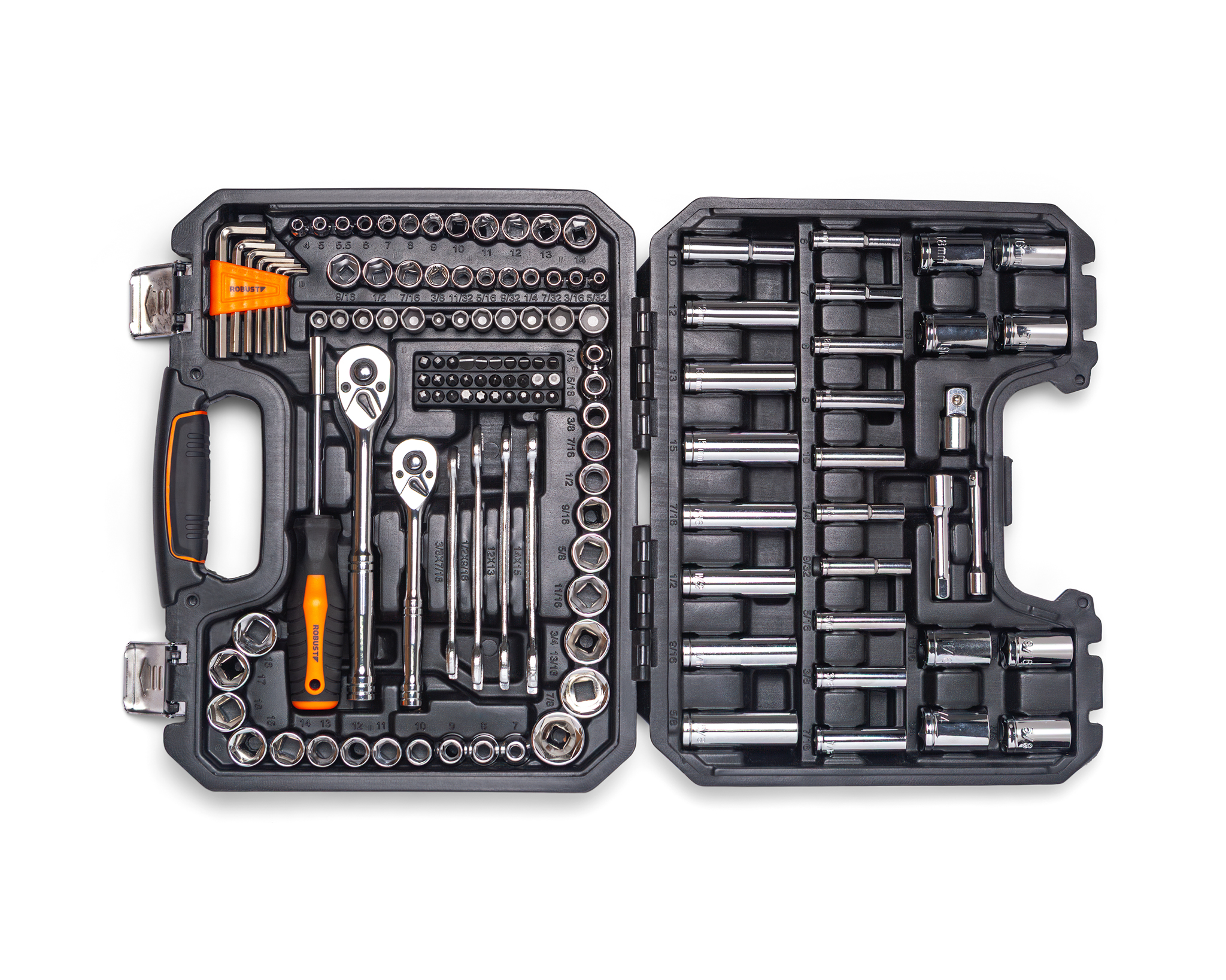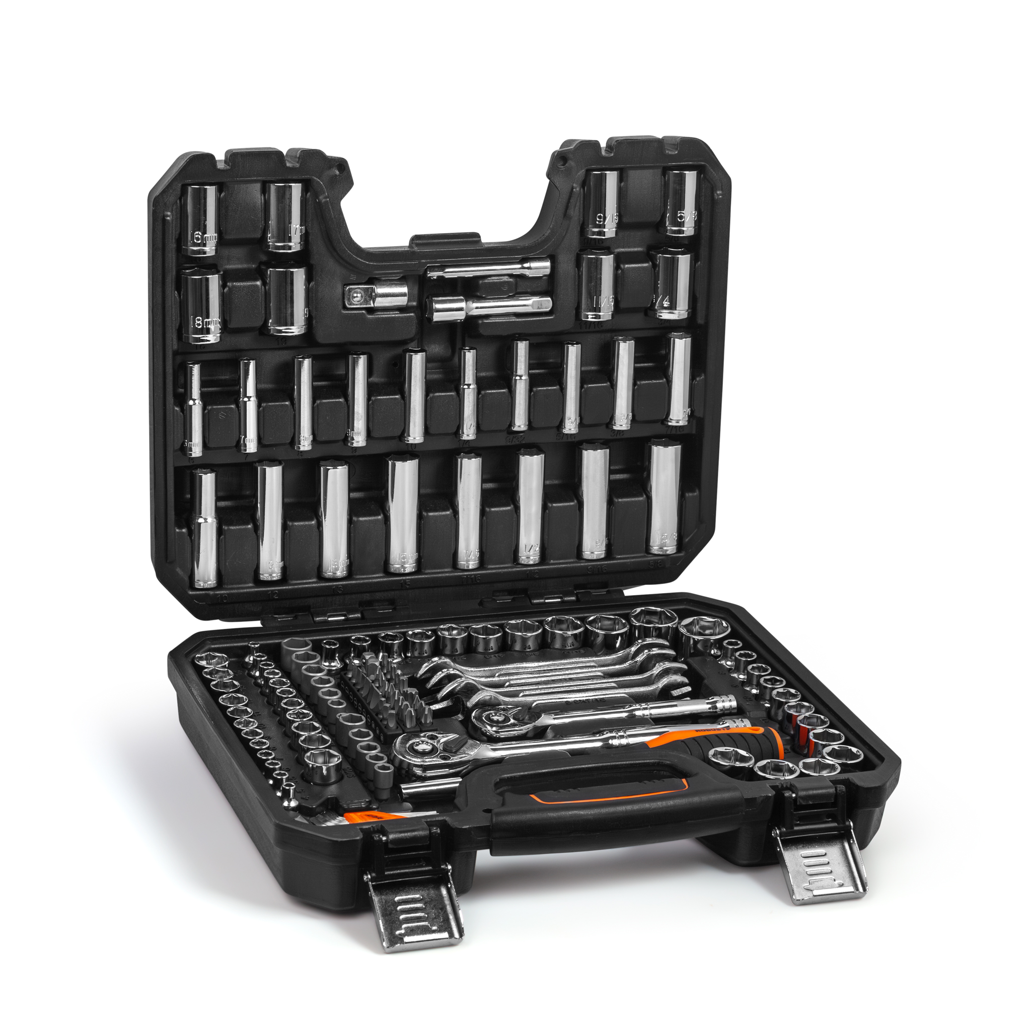 Jogo com 138 peças que abrange encaixes de ¼”, 3/8” e ½”, combinando medidas milimétricas e em polegada para ampliar as possibilidades de aplicação. O conjunto inclui soquetes longos, chaves fixas, bits, catracas, extensões e adaptadores, oferecendo uma solução completa com excelente custo-benefício para oficinas, profissionais e hobbistas exigentes.